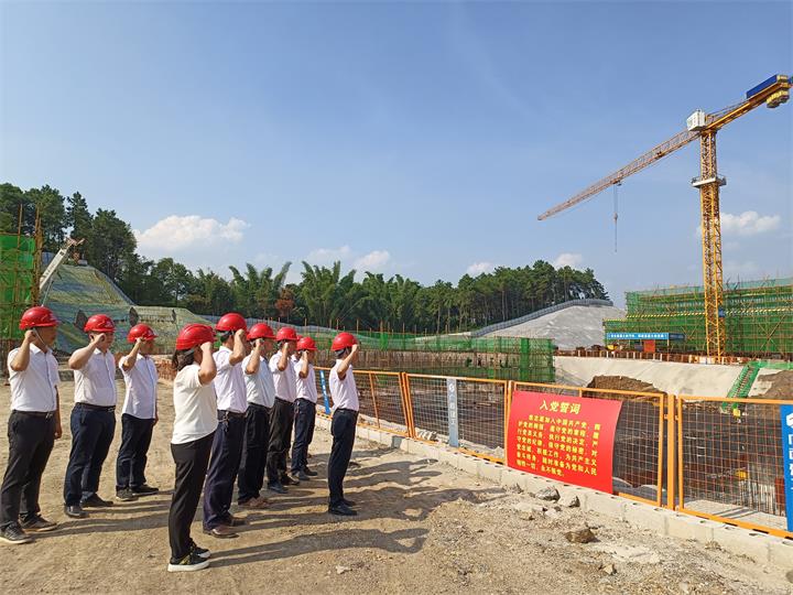 “我志愿加入中國(guó)共產(chǎn)黨,擁護(hù)黨的綱領(lǐng),遵守黨的章程,履行黨員義務(wù),執(zhí)行黨的決定……”項(xiàng)目建設(shè)施工現(xiàn)場(chǎng),黨員們面對(duì)莊嚴(yán)的黨旗,重溫了入黨誓詞。