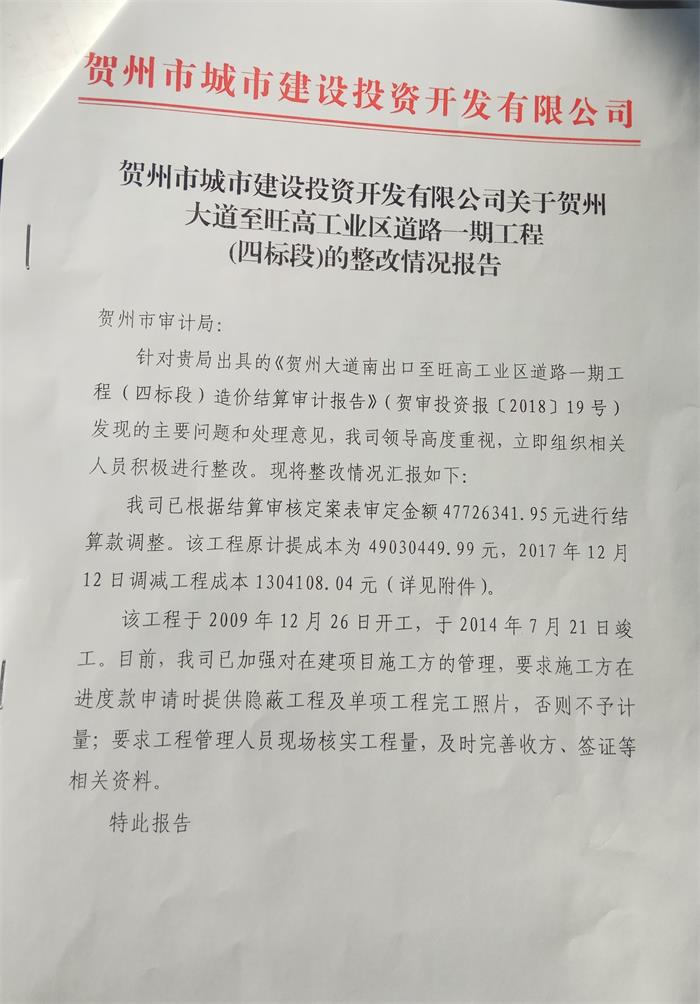 賀州市城市建設(shè)投資開發(fā)有限公司關(guān)于賀州市江南路網(wǎng)一期工程六、七標(biāo)段審計(jì)發(fā)現(xiàn)問題整改情況的報(bào)告 pdf