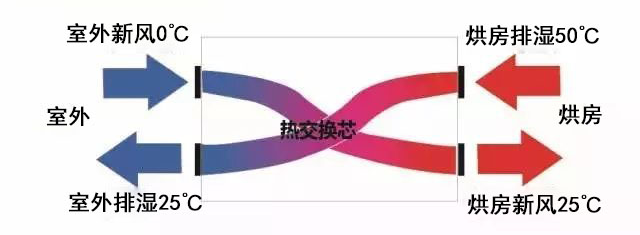 本產品可將烘房內排出的濕空氣與補入的進風進行交叉換熱,預熱新風,避免排濕過程中大量的能源浪費。